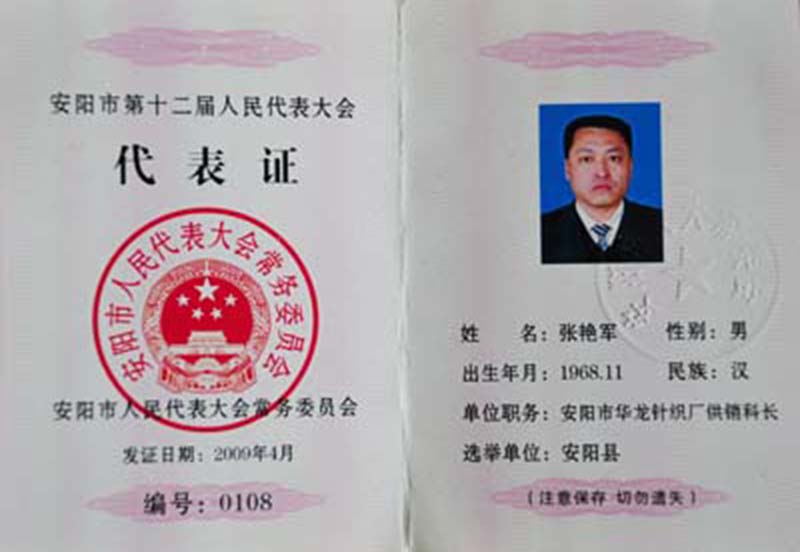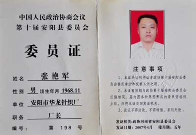 中國(guó)人民政治協(xié)商會(huì)議第十屆安陽縣委員會(huì)委員證